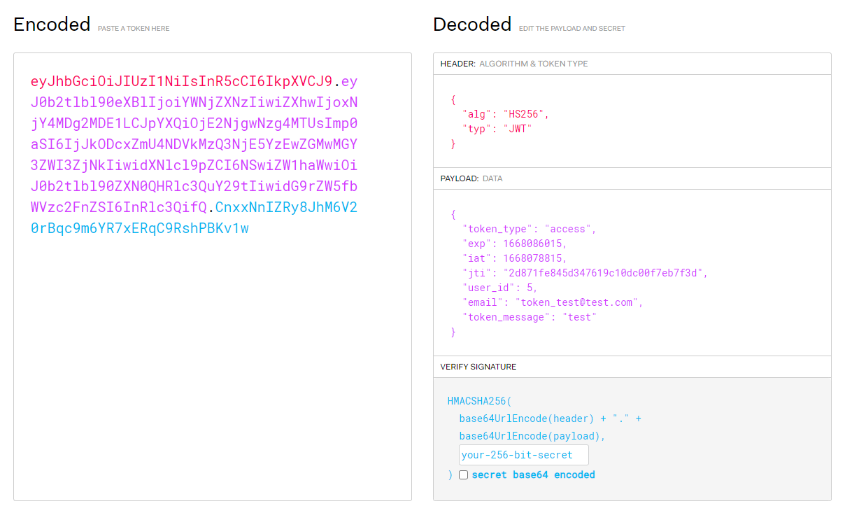 회원가입과 로그인을 구현하여 포스트맨으로 POST로 JSON형식으로 회원가입을 한 다음 로그인을 하면 access 토큰을 받을 수 있는데, 토큰에는 여러 정보가 담겨 있고 access 토큰에 담겨있는 정보를 확인하기 위해서 jwt.io에 접속하여 access토큰 값을 입력하면 Decoded의 PAYLOAD에 토큰의 정보가 출력된다.